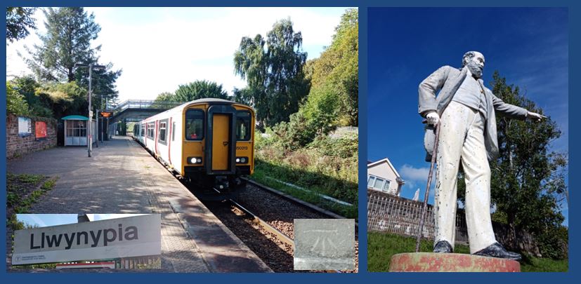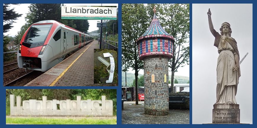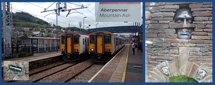 I was hoping for a ride on one of the new Flirt trains but it was not to be. A strenuous day. First a visit to the library to look at the Idris Davis display cabinet. Then a climb up to Rhymney Hill to find a geocache. Back to the town for chips then more sculptures, plaques, cemeteries, model village of Butetown and the Twisted Chimney sculpture.