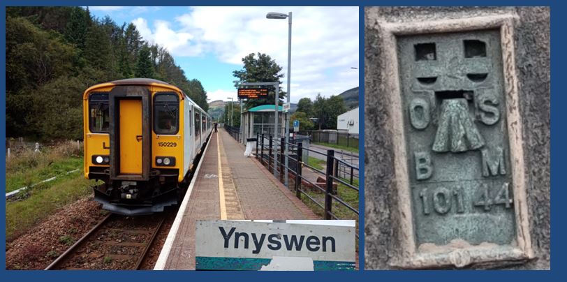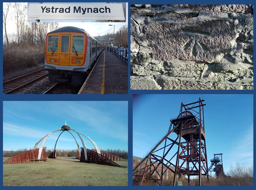 Train to Ystrad Mynach then a steep walk up to Penallta Park. Relaxed on the seats of the sculpture before heading down to explore winding wheels of the old colliery and then onto Hengoed, finding a benchmark on the way.