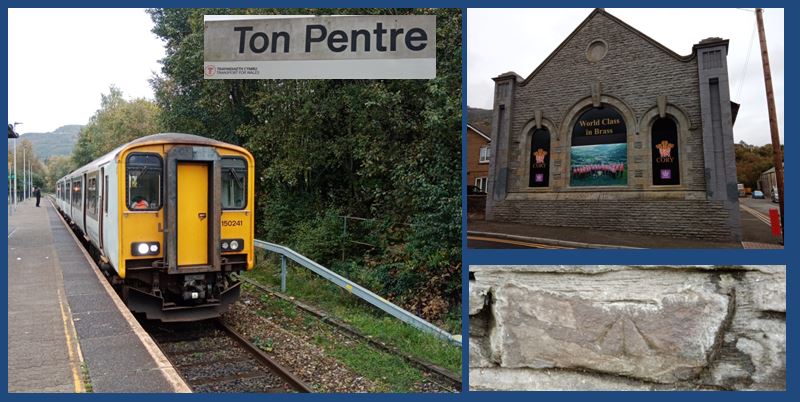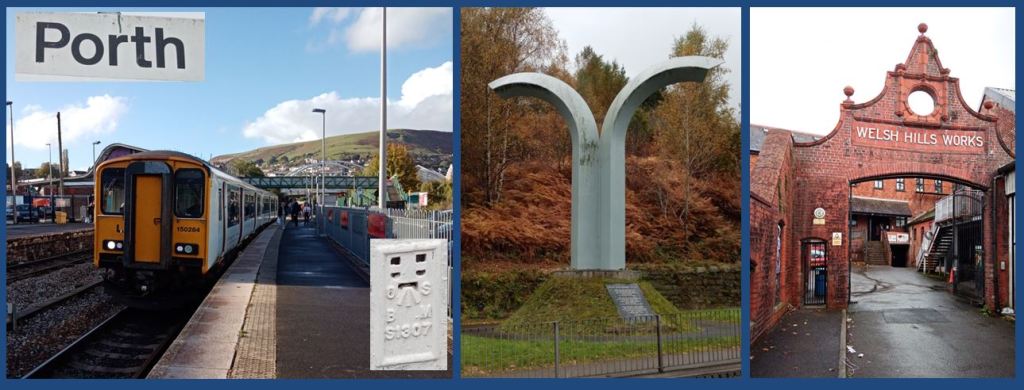 Some nice bits of history detailed on an information board in the station. Wandered around the town a bit. Admired some of the old buildings. Found three benchmarks and failed to find one geocache. Then walked down to Ystrad Rhondda.