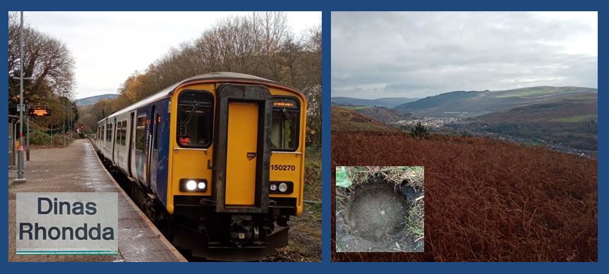 Arrived at Dinas Rhondda in a train on loan from Northern Rail. Walked north from there up to Mynydd Brith Weunydd and discovered a concrete ring trig point – such excitement – maybe only for the trig point aficionados among you. Descended into Porth and onwards to Trehafod.