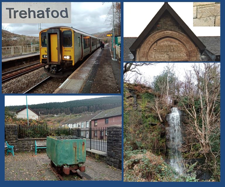 Caught the train to Dinas Rhondda then went up a hill and down into Porth then up Penrhiwgwynt hill before making my way down to Trehafod. Stopped and admired the Darren y Pistyll waterfall, found a geocache then onto Trehafod station. I had some time before my train arrived, enough to see the old coal dram outside the station and find a benchmark on the old board school.