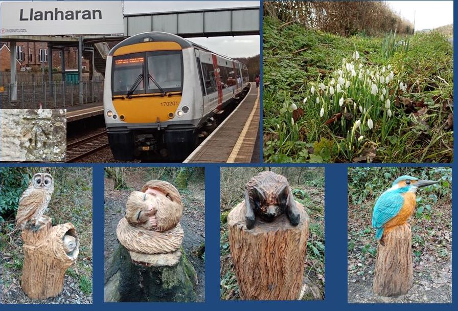 Walked over from Pencoed. Snowdrops are out. Beautiful new wooden sculptures in Brynna Woods by sculptor Chris Woods. Didn’t find the geocache near the stations so scampered beck up the rod and bagged a cut benchmark.