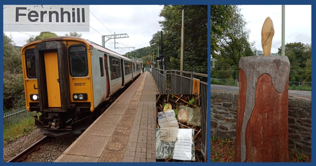 Well that didn’t go as planned. My fault for not doing enough homework. I got off at Fernhill aiming to go looking for a geocache near the hospital but there was no way to cross the track at present so I had to walk back to Mountain Ash and then back up the other side to get to it. On the way I spotted a piece of wooden sculpture in the shape of a candle in the cemetery. Oh, by the way I found the cache but it was pretty difficult.