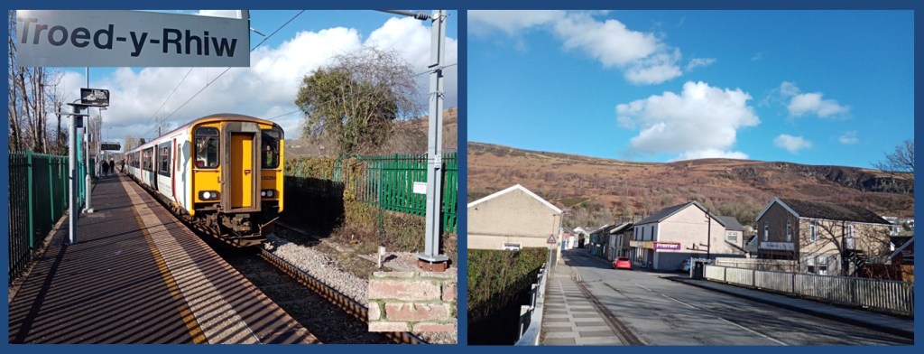 A quick stop at Troed-y-Rhiw enabled me to find one of the two benchmarks I looked for and then admire the colourful flower shop doing a brisk trade for Valentine’s Day, some sculptures in the railings near the station and the sunny skies over the nearby hills.