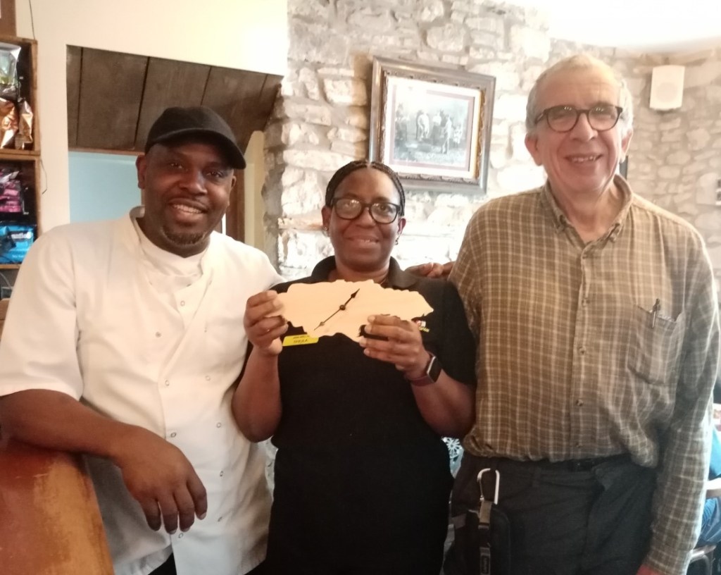 We wanted to sample some Jamaican cuisine was part of my Armchair Travel Challenge and had heard about Jam-Welsh based at the Horseshoe Inn, Llangattock.  We had a lovely Coconut Vegan Curry served in ½ pineapple and a Jamaican Spice Jerk Chicken Breast Burger, served with chilli & mango salsa, chips & coleslaw. I later gifted chef Raymond and Sheila a clock in the shape of Jamaica I had made earlier in the week.