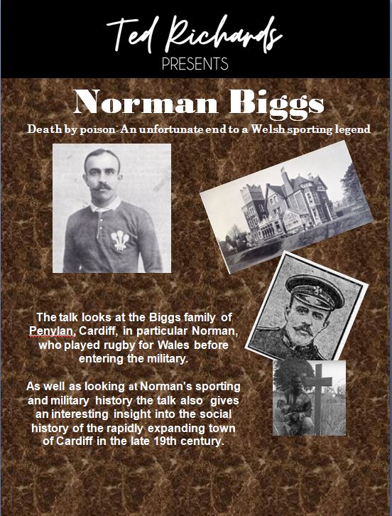 The talk looks at the Biggs family of Pen-y-lan, Cardiff, in particular Norman, who played rugby for Wales before entering the military.