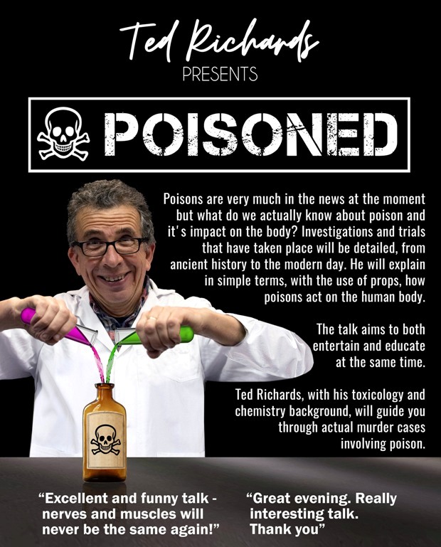 Ted Richards, with his toxicology and chemistry background, will guide you through actual murder cases involving poison from ancient history to the modern day. Investigations and trials that have taken place will be detailed. He will explain in simple terms, with the use of props, how poisons act on the human body. The talk aims to both entertain and educate at the same time.