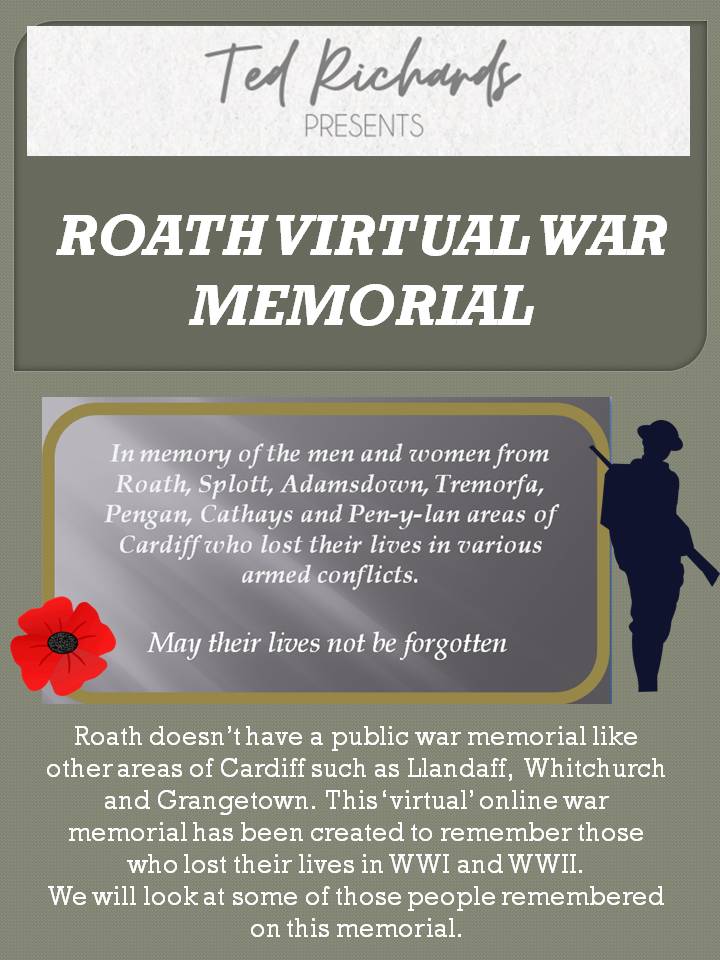 Roath doesn’t have a public war memorial like other areas of Cardiff such as Llandaff, Whitchurch and Grangetown. This ‘virtual’ online war memorial has been created to remember those who lost their lives in WWI and WWII. We will look at some of those people remembered on this memorial.